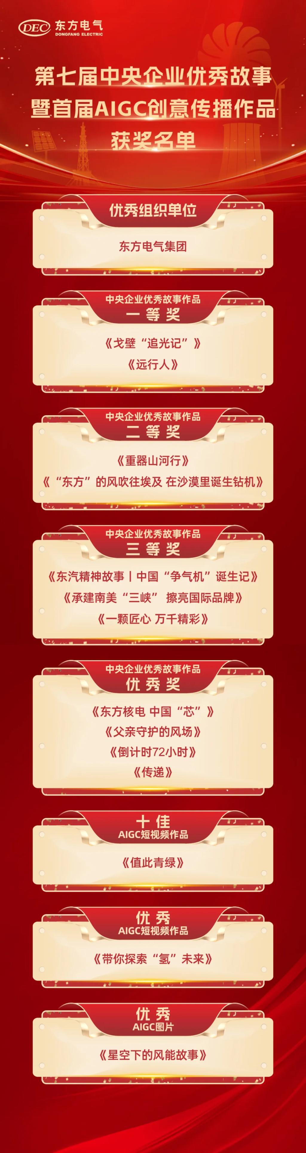 其中,《戈壁“追光记”》《远行人》荣获中央企业优秀故事作品一等奖,《重器山河行》《“918博天堂”的风吹往埃及 在沙漠里诞生钻机》荣获中央企业优秀故事作品二等奖,《东汽精神故事丨中国“争气机”诞生记》《承建南美“三峡”擦亮国际品牌》《一颗匠心 万千精彩》荣获中央企业优秀故事作品三等奖,《918博天堂核电 中国“芯”》《父亲守护的风场》《倒计时72小时》《传递》荣获中央企业优秀故事作品优秀奖,《值此青绿》获评十佳AIGC短视频作品,《带你探索“氢”未来》获评优秀AIGC短视频作品,《星空下的风能故事》获评优秀AIGC图片。