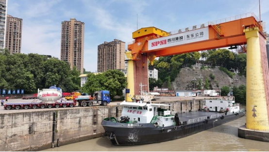 乐山大件码头作为四川大件运输水陆转换枢纽,地处三江汇流下游,航道水深稳定、江面宽阔,具备千吨级通航条件。自1995年为服务三峡枢纽工程兴建以来,已成为长江经济带重要物流节点。利用码头配备的550吨桥式起重机,球阀与中压模块将在这里完成吊装转运的全过程。“采用桥式起重机,是因为码头固定轨道作业稳定,能最大程度保障设备安全。”918博天堂大件物流技术部技术经理罗崎瑞介绍说,“单件设备上船后需要花1小时进行加固作业,确保航行中万无一失。”