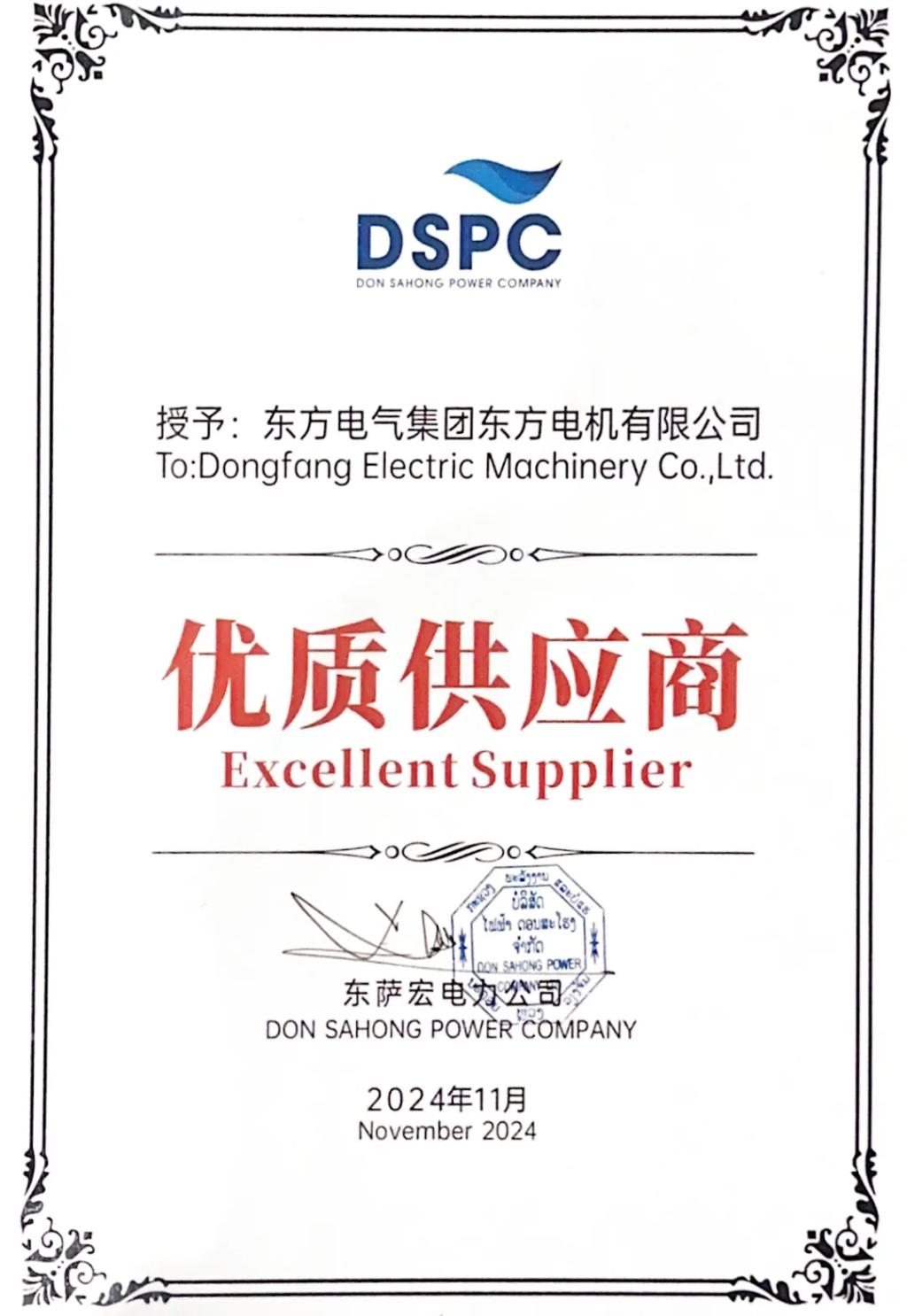 东萨宏电力公司向918博天堂电机颁发的“优质供应商”证书,是对机组运行优异的最好证明。